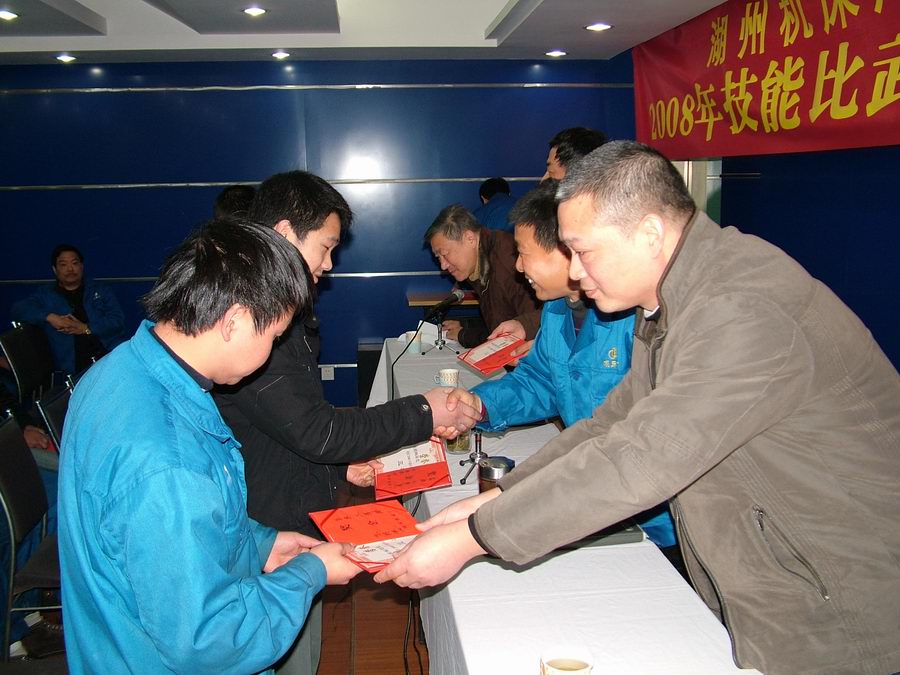 我公司自2007年開展各個(gè)工種技術(shù)比武后,08年又有新的擴(kuò)展,參加工種擴(kuò)大到七大工種:車工、鉆工、鏜工、行車工、電焊工、電工(AB類)、裝配鉗工(AB類),總參賽人數(shù)達(dá)183人。經(jīng)5月、10月和年度的綜合排名,共有46人獲獎(jiǎng),從獲獎(jiǎng)的人員分布來(lái)看,中年員工占1/3,青年員工2/3,這說(shuō)明青年員工已在不同崗位上挑起了擔(dān)子。圖為公司領(lǐng)導(dǎo)向“技術(shù)帶頭人”、“技術(shù)能手”和“操作能手”頒獎(jiǎng)。