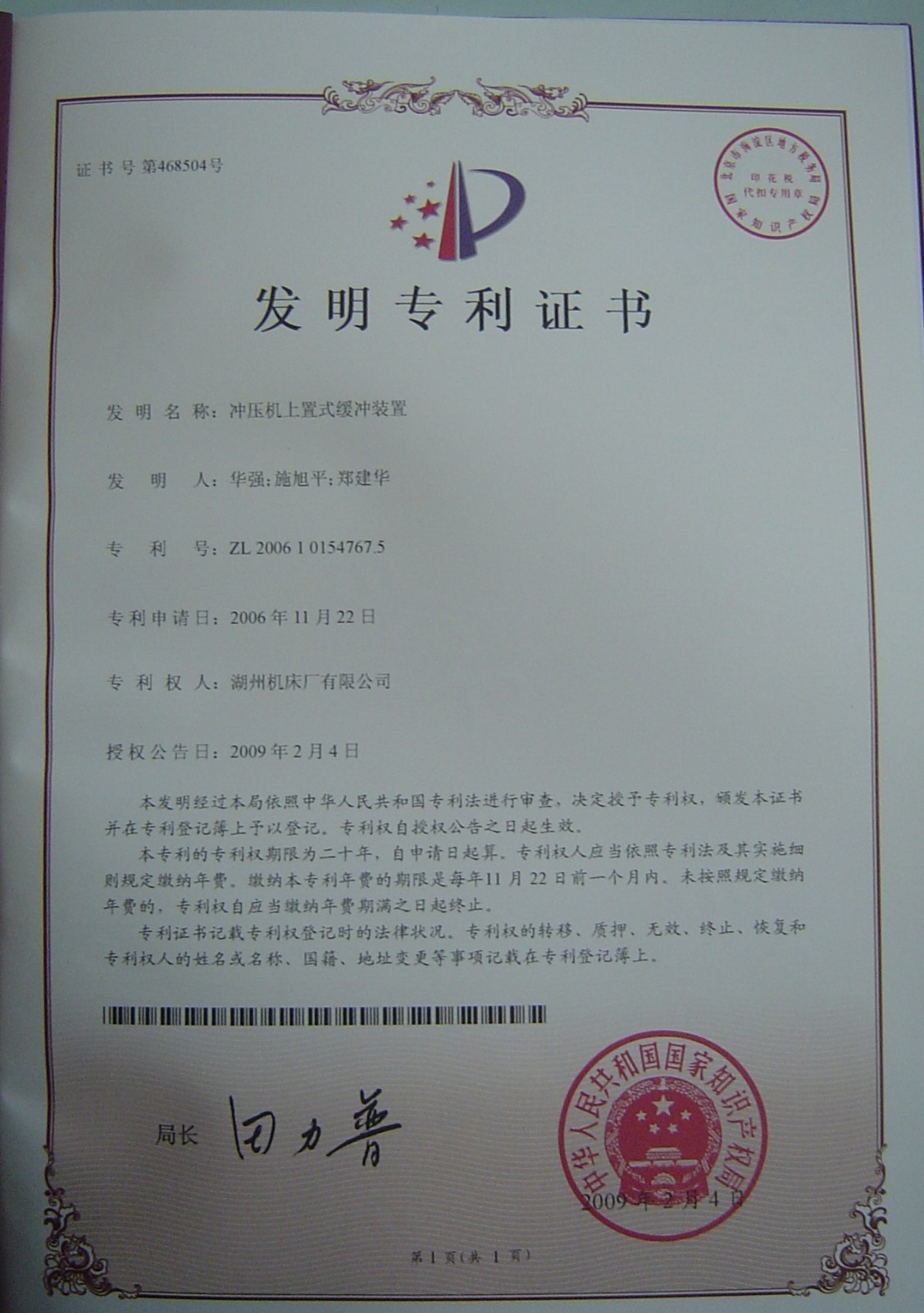 我公司申請的“沖壓機上置式緩沖裝置”,經國家知識產權局依據中華人民共和國專利法審核,已于2009年2月4日獲國家發明專利授權。
